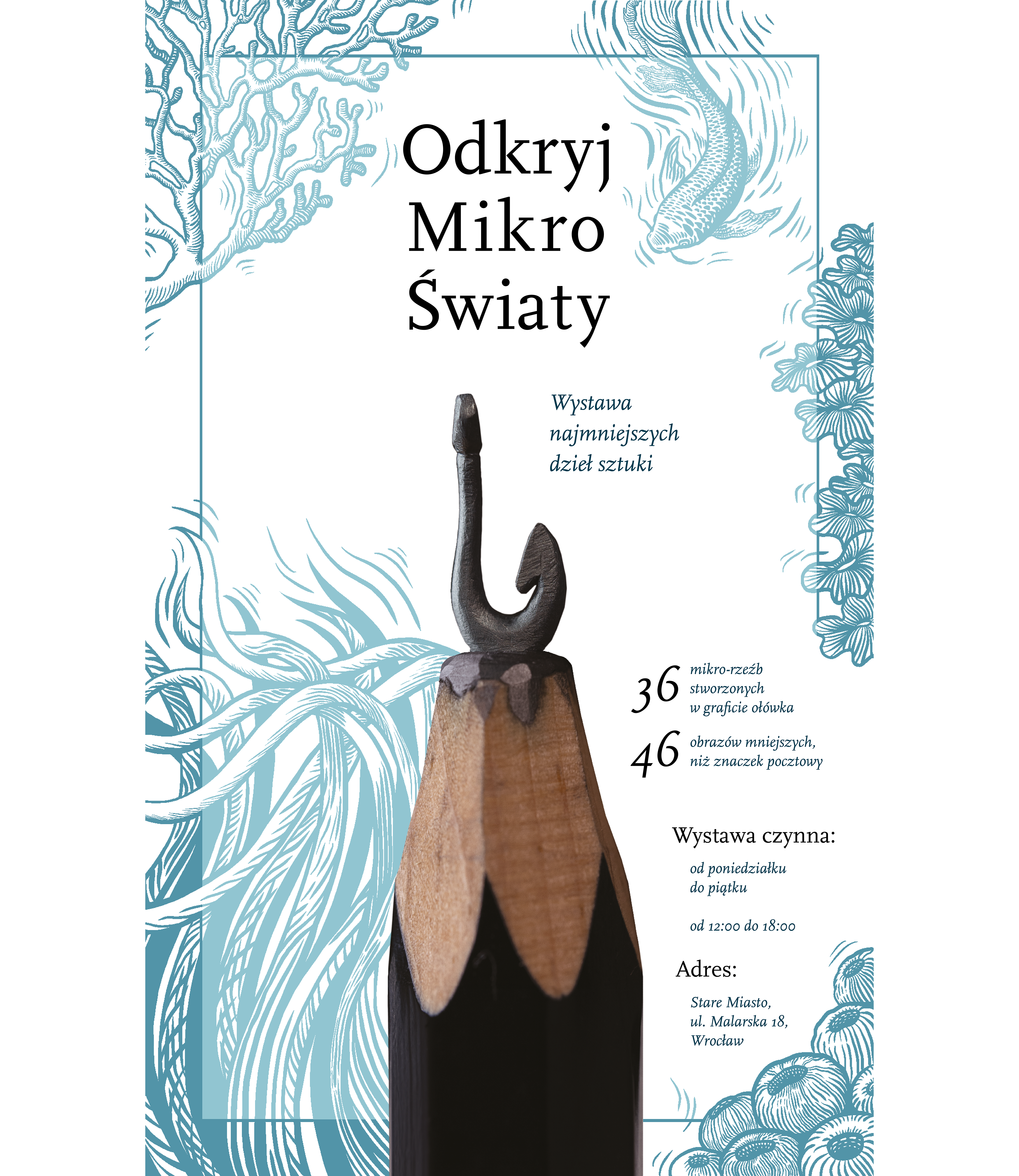 The project was developed to promote the Micro Art Exhibition, held in an intimate space within a historic townhouse on Wrocław’s main square. The exhibition showcases sculptures carved into pencil graphite and paintings created on surfaces no larger than a coin.